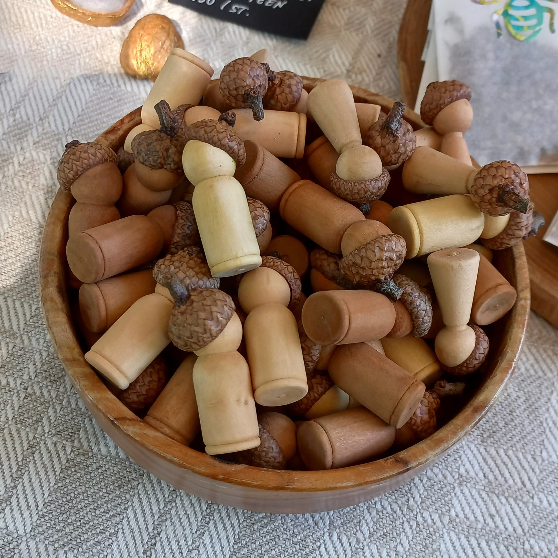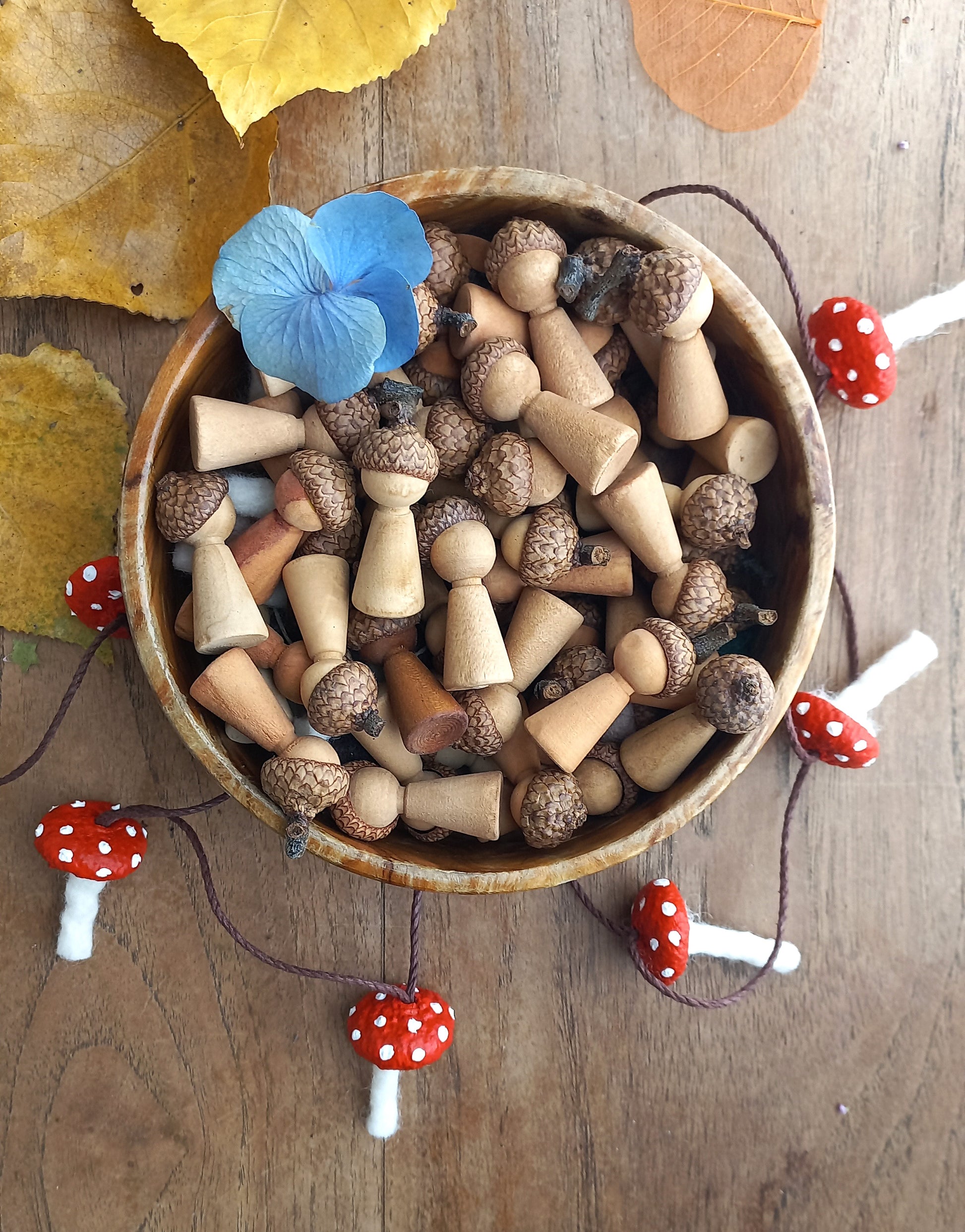 Ze passen zo fijn in de hand van je kind. De natuurlijke kleuren en materialen- hout en eikeldopjes prikkelen de fantasie.