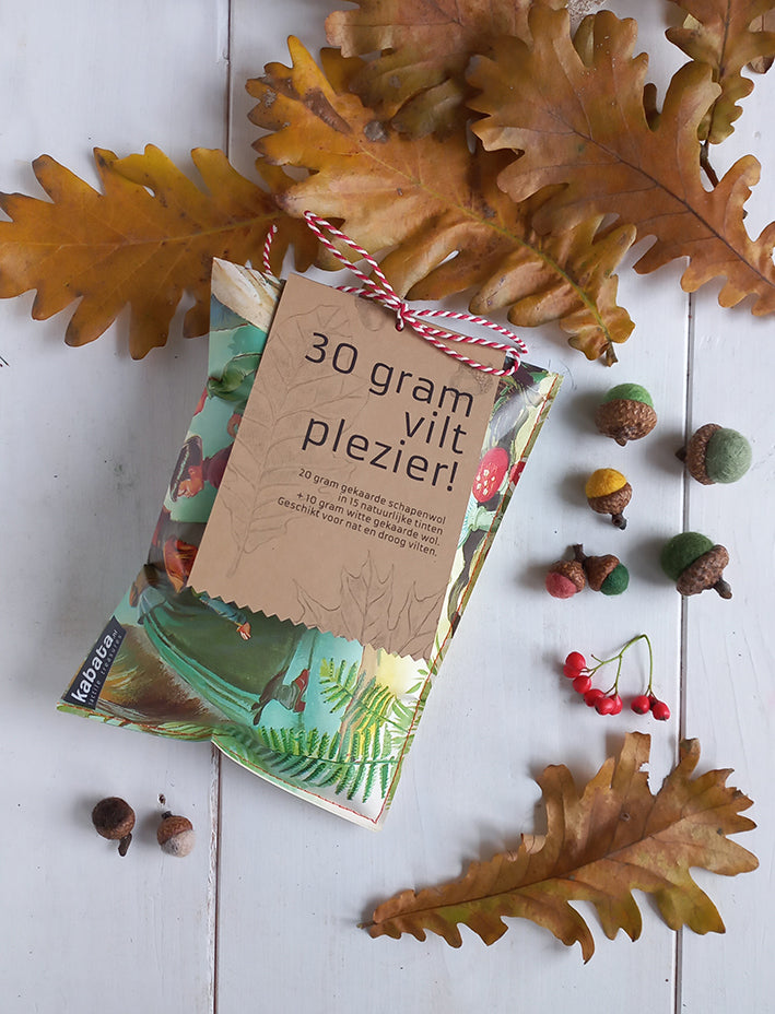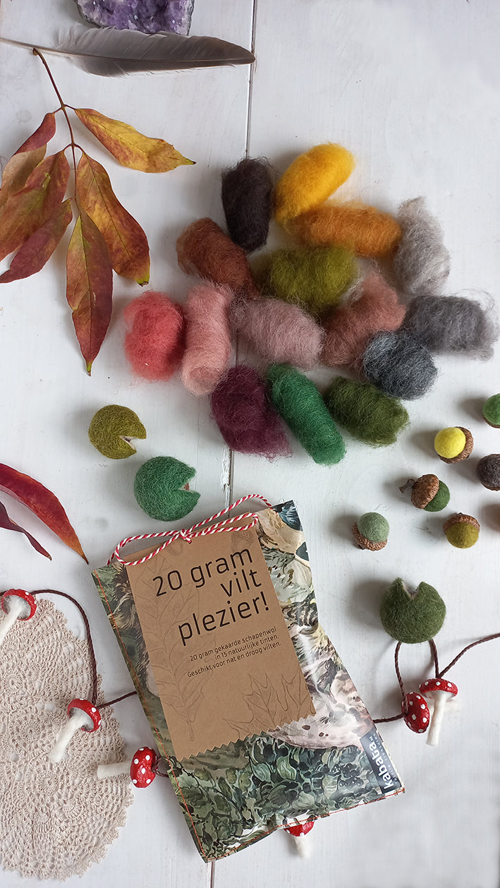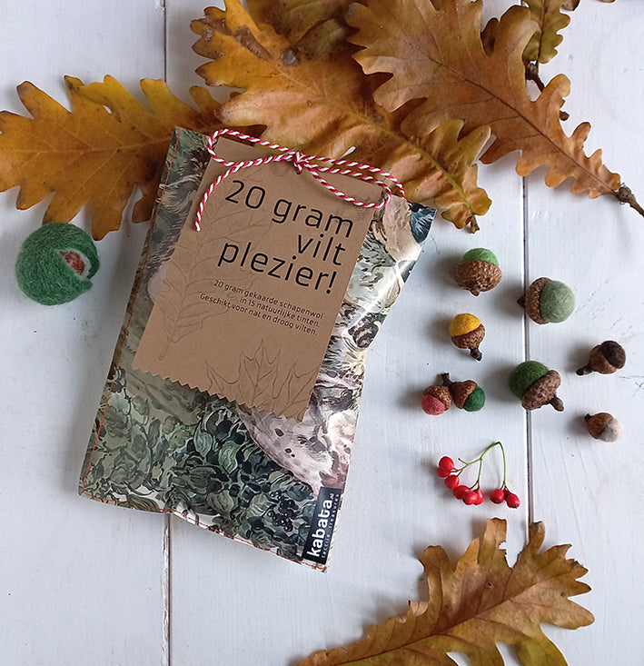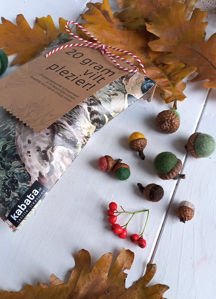 Met de 20 gram pakket kan je bijvoorbeeld 15 grote eikeltes vilten. Maak je ze kleiner? Dan- zeker meer.