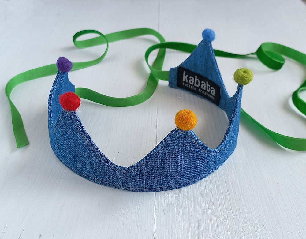 Deze vrolijke kronen zijn gemaakt van pre-loved (met liefde gedragen en gewassen) spijkerbroeken. Ik maak ze af met een satijn of velours lint en vrolijke gekleurde vilt balletjes als de kers op de taart. Je kan het als verjaardag kroon gebruiken maar zeker is het een succes tussen de verkleed kleren.