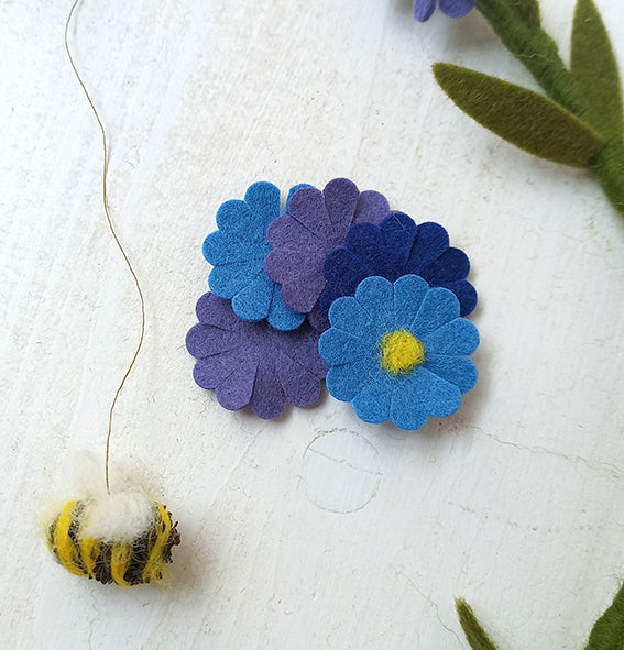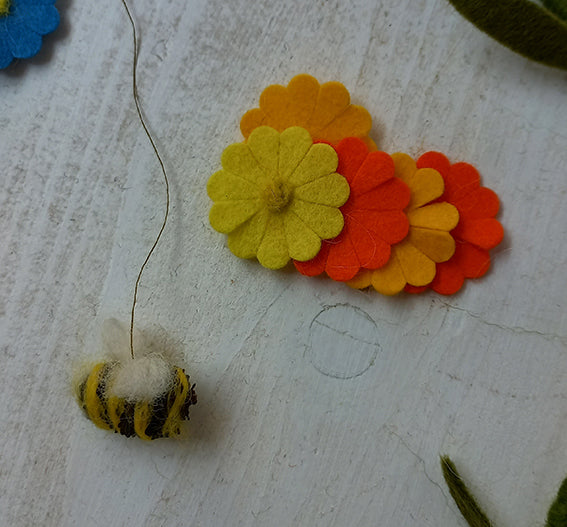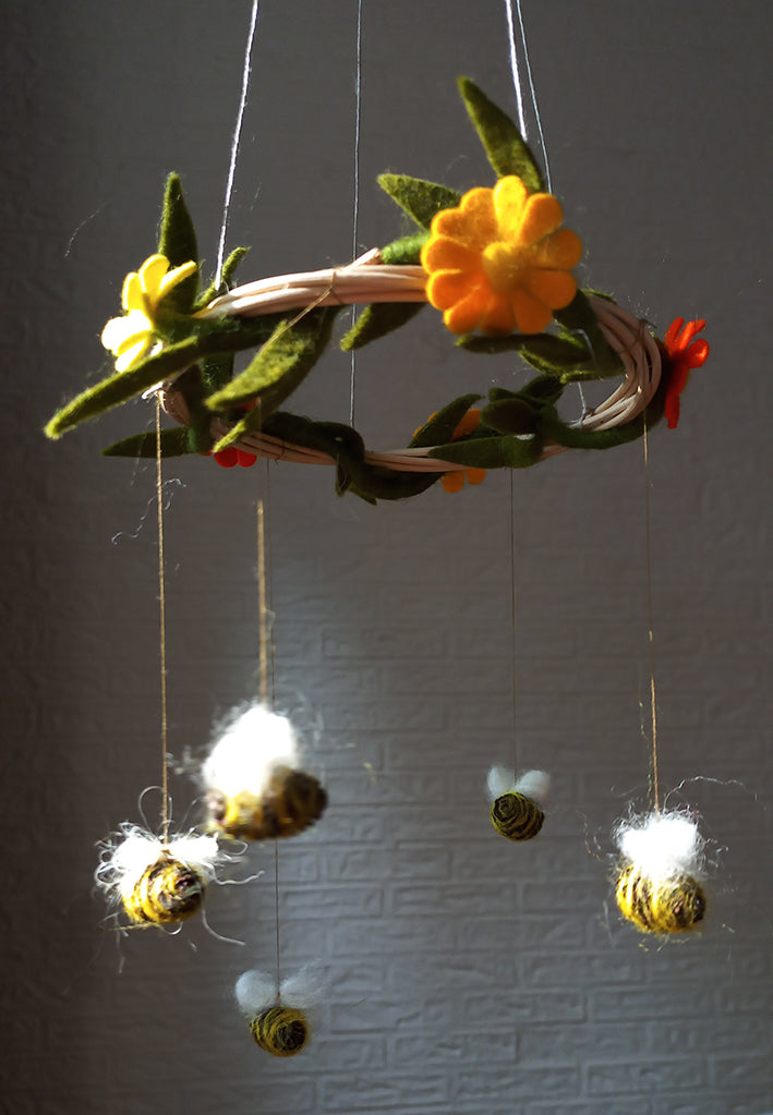 Met deze zomerse mobile breng je de beste van het seizoen in je huis. Bijtjes van els propjes en wol die zachtjes rond dansen en zachte wolvilt bloemetjes aan een groene tak.